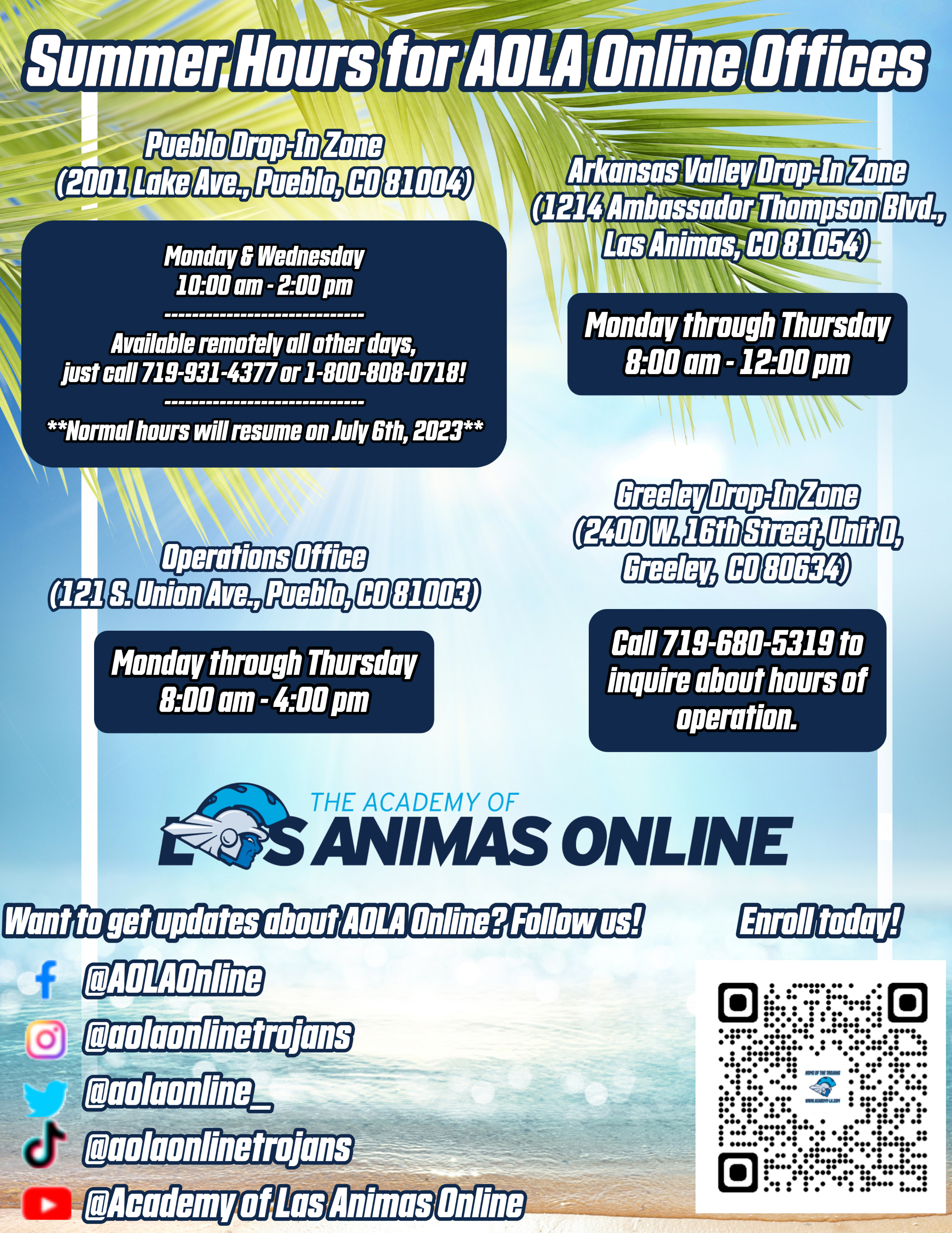 Please see the attached flyer of our hours of operation during Summer Break for all of our offices across Colorado!